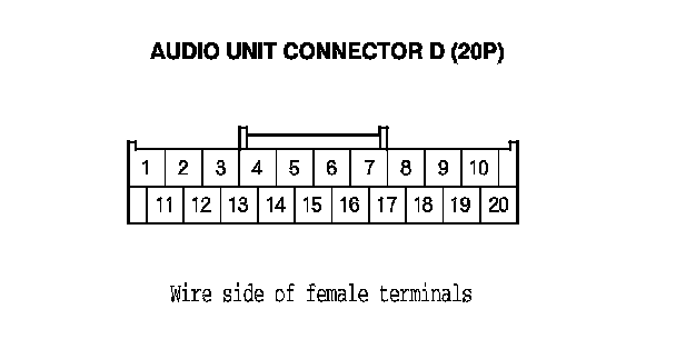 10. Check for continuity between the terminals of the audio unit connector D (20P) and body ground according to the table.