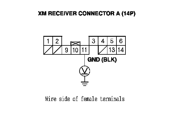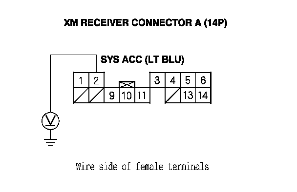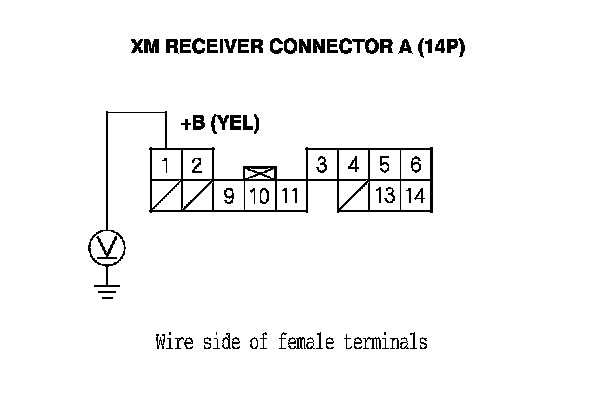 9. Measure the voltage between XM receiver connector A (14P) terminal No. 2 and body ground.