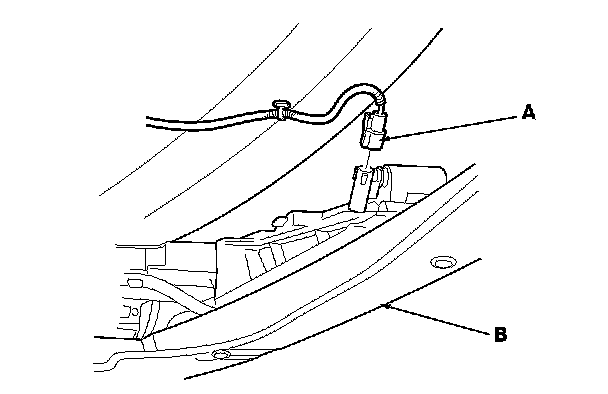 1. Disconnect the outside temperature sensor connector (A) from under the front bumper (B).