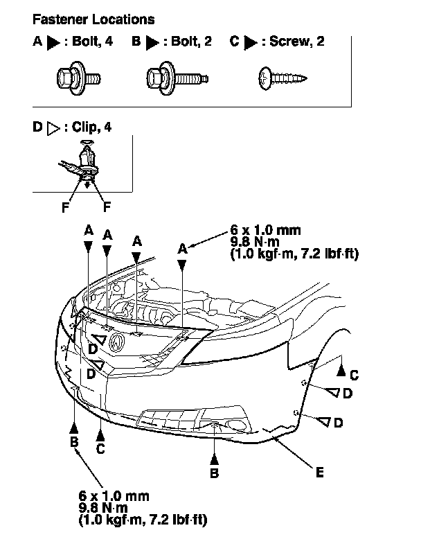 3. Remove the bolts (A, B), the screws (C), and the clips (D) securing the front bumper (E).