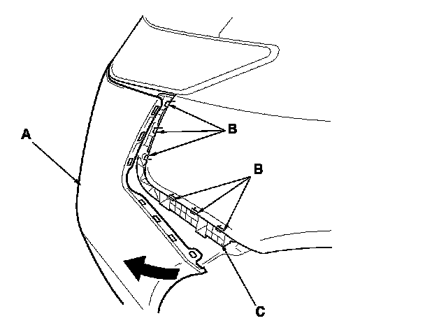 4. Pull on the front bumper (A) at the wheel arch areas to release it from the hooks (six places) (B) on the side spacers (C).
