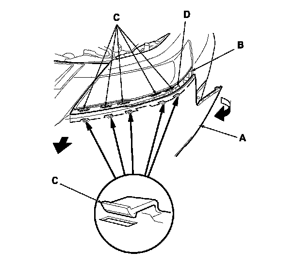 5. With the help of an assistant, pull both sides of the bumper (A) away from the side spacers (B). Then pull the bumper out to release the hooks (C) from the upper beam (D).