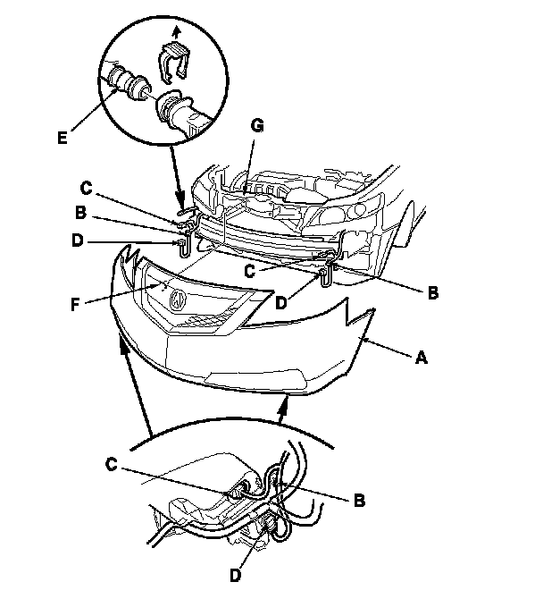6. Hold up the bumper (A), and detach the harness clips (B). Disconnect the front turn signal connectors (C), the fog light connectors (D), and, if equipped, the headlight washer tube (E). Release the projection (F) from the bulkhead (G), then remove the bumper.