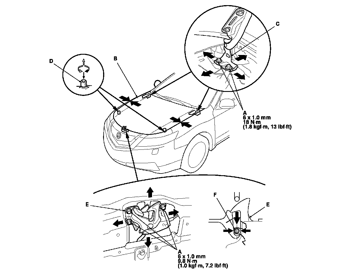 4. Adjust the hood latch (E) to obtain the proper height at the forward edge, and move the hood latch right or left until the striker (F) is centered in the hood latch.