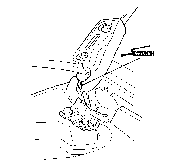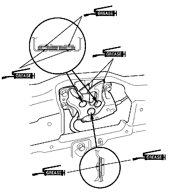 8. Apply multipurpose grease to the hood latch and the hood hinges as indicated by the arrows.