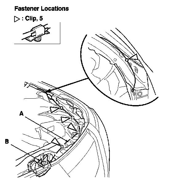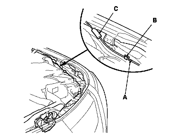 3. Detach the clips with a clip remover, and remove the grommet (C) from the body, then remove the hood opener cable from the vehicle. Take care not to kink the cable.