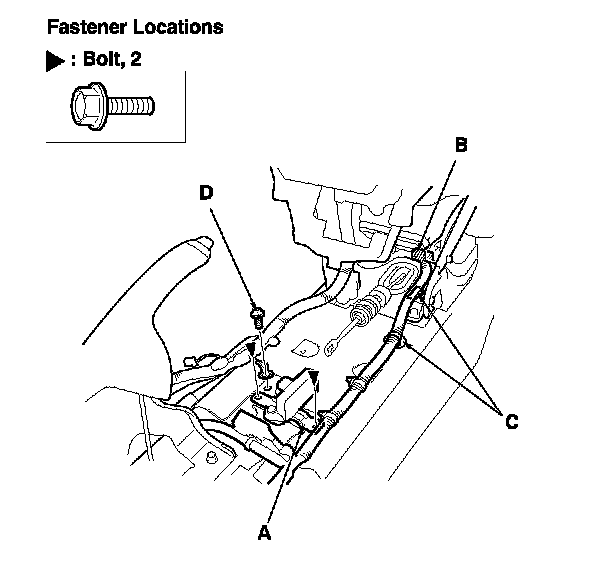 2. Remove the bolts, then remove the yaw rate-lateral acceleration sensor mounting bracket (A). Detach the harness clips (C), and remove the ground bolt (D) with a TORX T30 bit. Disconnect the SRS unit connector B.