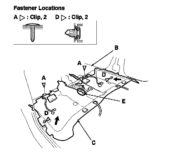 4. Pull the rear carpet out by detaching the clips (D), cut the carpet in the areas (E) shown, then remove the carpet.