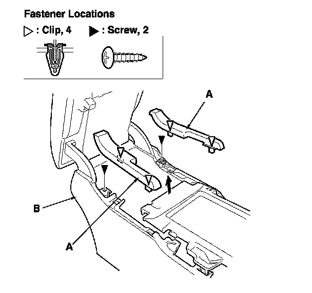 2. Gently pull out the console upper trim (A) to detach the clips, and remove the trim, then remove the screws securing the center console (B).