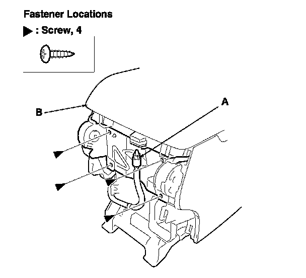 3. Turn the center console light socket (A) 45 ° counterclockwise to remove the socket from housing, and remove the screws securing the center console armrest (B).