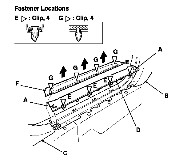 2. If necessary, pull the front side outer trim (F) up to detach the clips (G), then remove the trim.