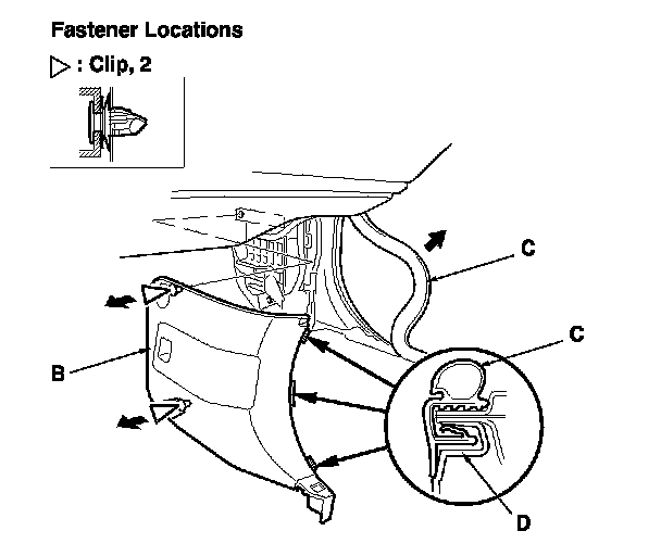 -1 Pull out the door opening seal (C) as needed from the kick panel hooks (D).