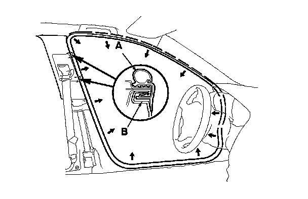 5. Pull out the front door opening seal (A) from the trim hooks (B) around the front door opening flange, then remove the seal.