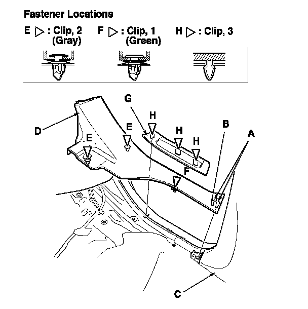 3. If necessary, pull the rear side outer trim (G) up to detach the clips (H), then remove the trim.