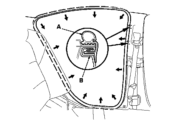5. Pull out the rear door opening seal (A) from the trim hooks (B) around the rear door opening flange, then remove the seal.