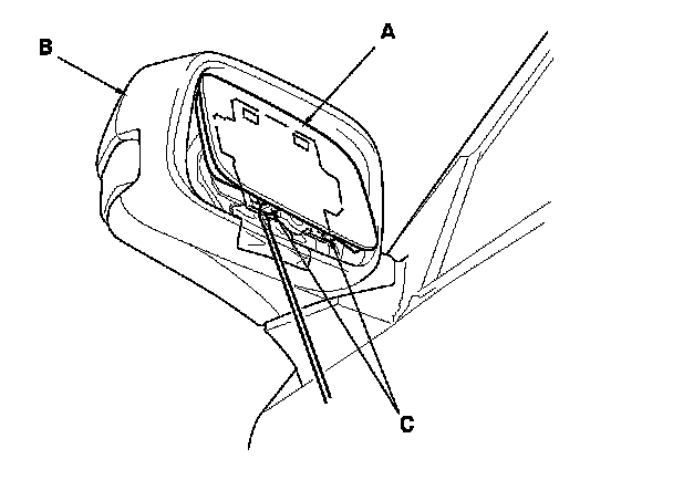 3. Carefully pull out the bottom edge of the mirror holder (A) to separate the adhesive (B), and then release the side clips (C).