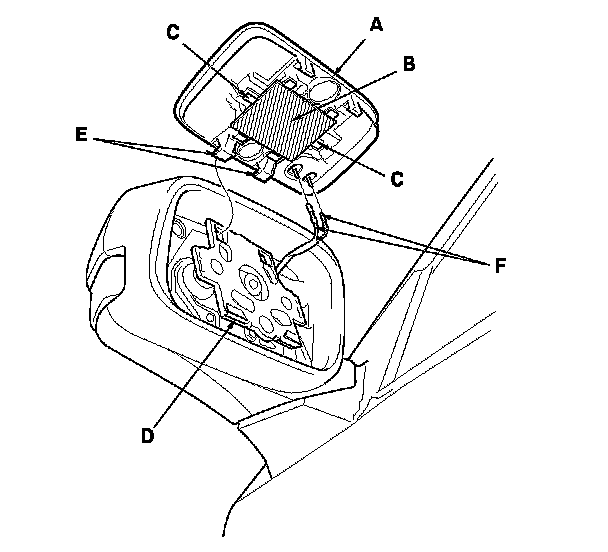 4. Separate the mirror holder from the actuator (D) by releasing the hooks (E), and disconnect the mirror defogger connectors (F).