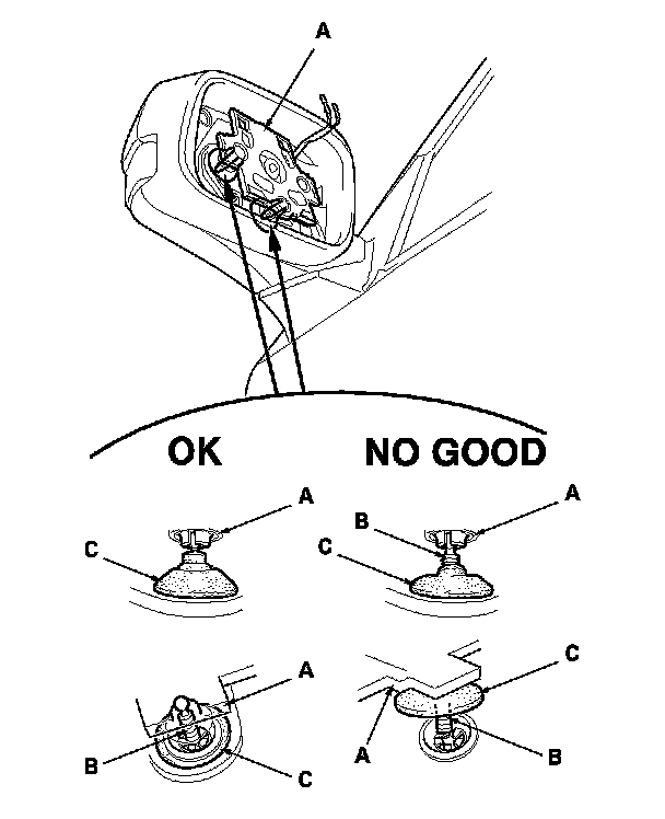 5. Before reinstalling the mirror holder to the inner holder (A) on the actuator, check the actuator rods (B) and the actuator boots (C):
