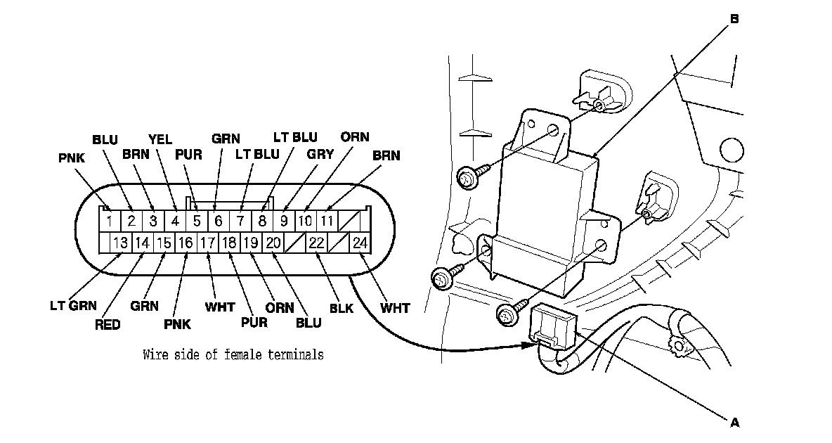 3. Disconnect the 24P connector (A) from the power mirror control unit (B).