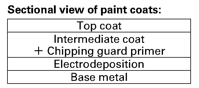 The removal of paint and undercoating by stone chips immediately exposes metal to the atmosphere, causing it to oxidize. The thickness of this oxidation increases if the process continues unchecked. The soft chipping guard primer protects against damage due to the impact of such objects.
