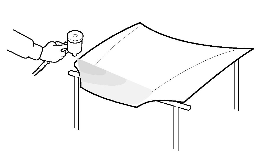 - Spray the primer surface (2-part urethane primer surfacer) on the soft chipping guard primer coating areas when you replace parts using soft chipping guard primer coat.