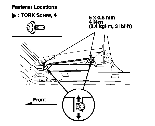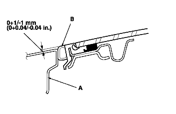 The roof panel (A) should be even with the glass weatherstrip (B), to within 0+1/-1 mm (0+0.04/-0.04 in.) all the way around. If not, make the following adjustment:
