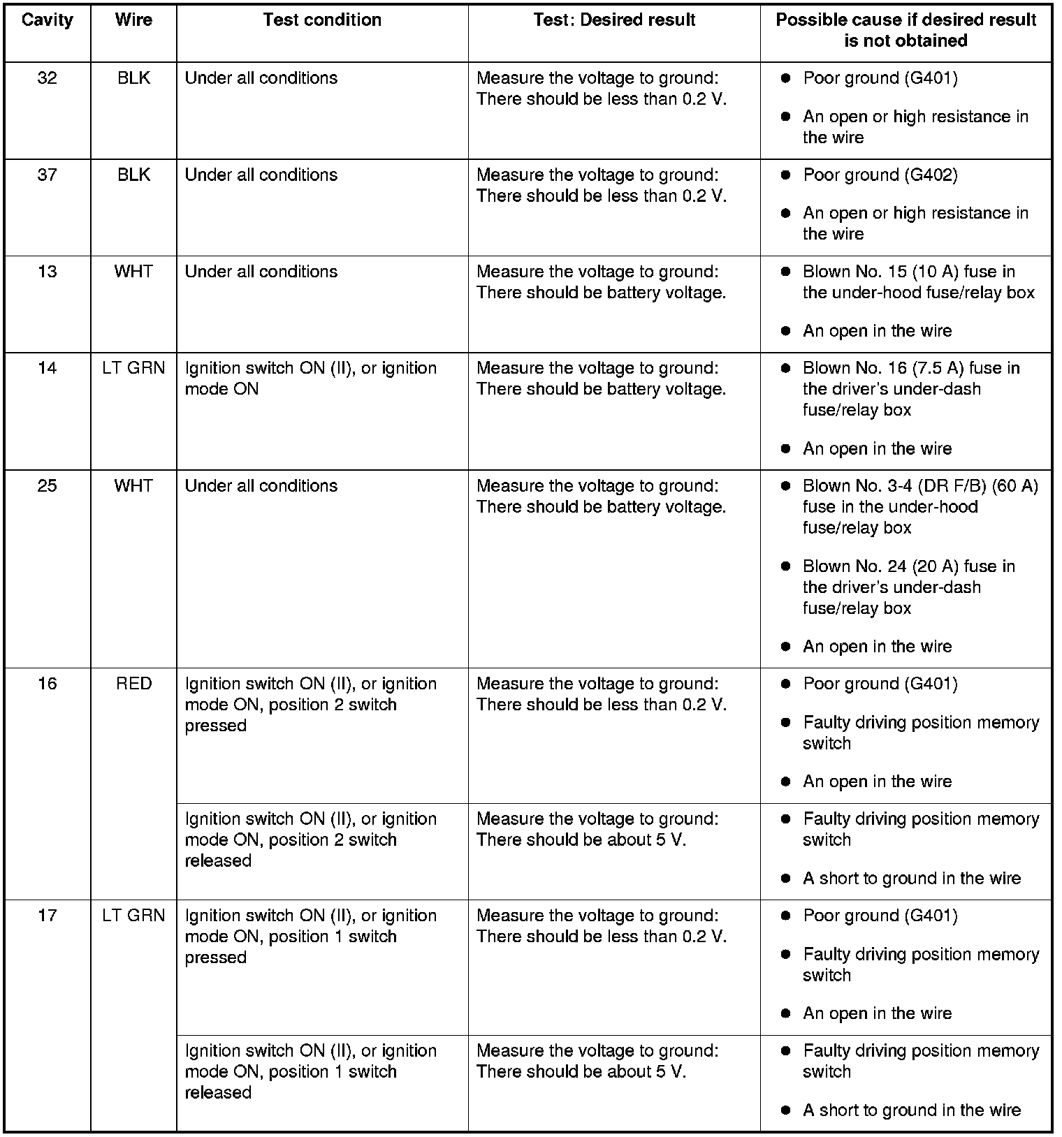 5. Reconnect the connector to the power window master switch, and do these input tests at the following connector.