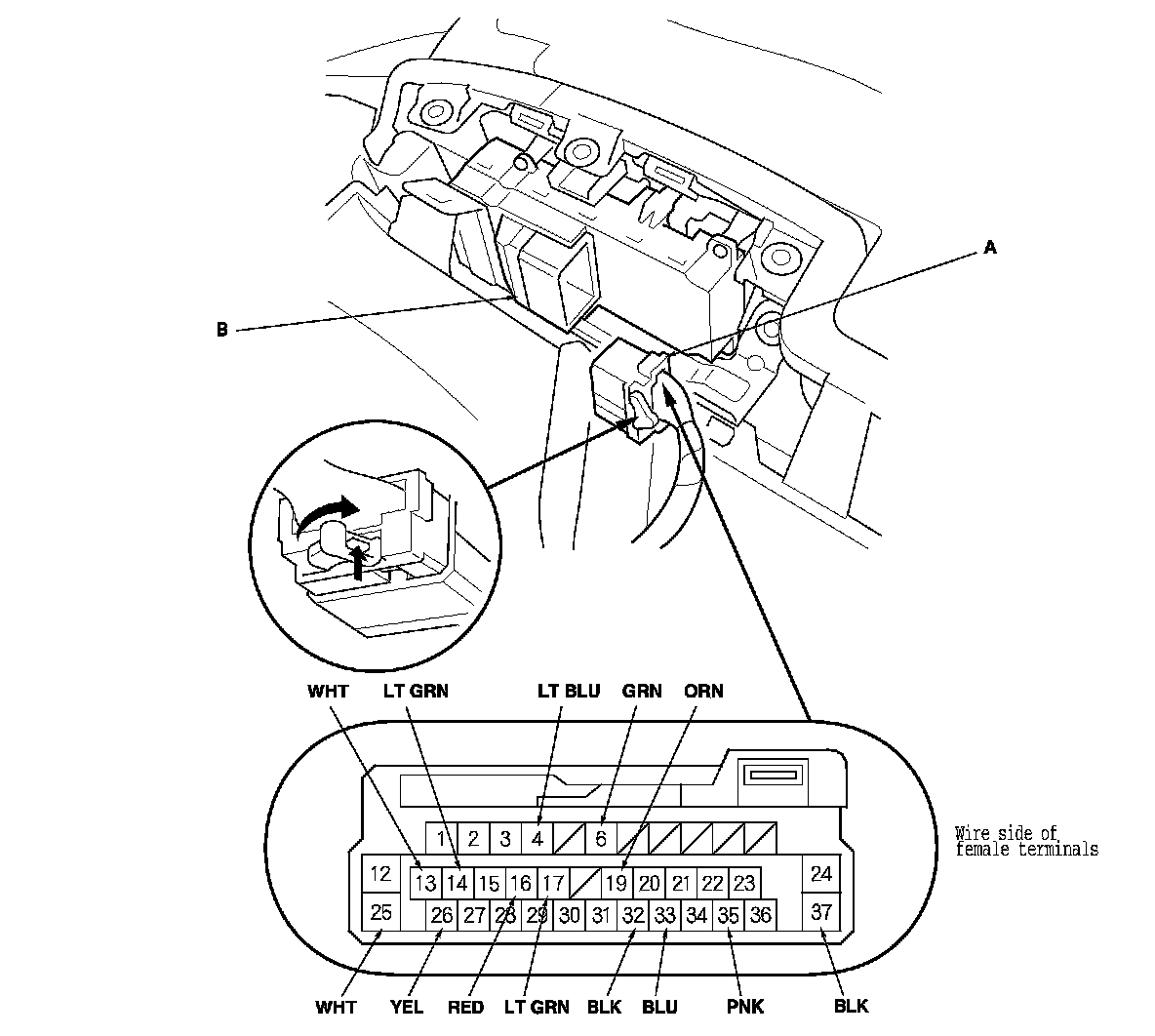 3. Disconnect the 37P connector (A) from the power window master switch (B).