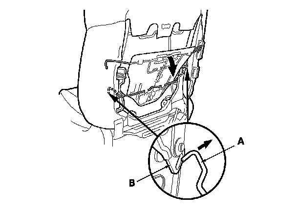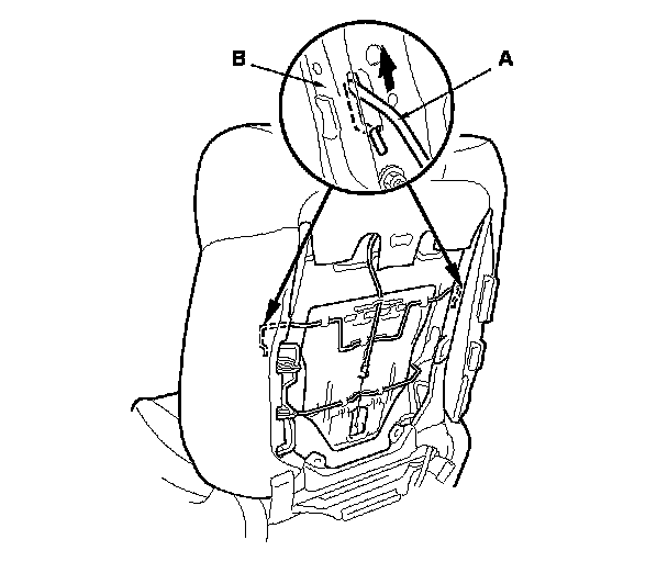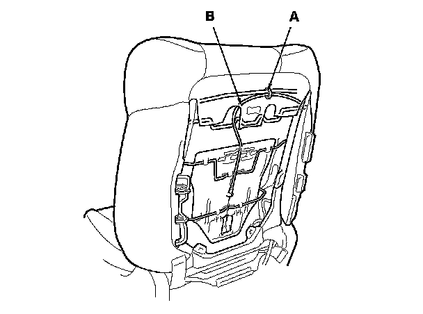 6. Release the lower wires (A) from both active head restraint links (B) inside the seat-back.
