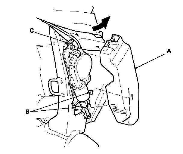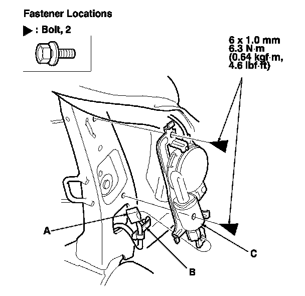 8. Disconnect the lumbar support motor connector (A), and detach the harness clip (B). Remove the bolts, then remove the lumbar support motor (C).