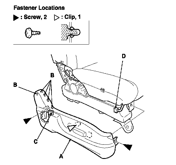 2. Remove the screw, and release the hook (A), the tabs (B), and the pin (C), then remove the front cover (D). The driver's seat is shown; the passenger's seat is symmetrical.