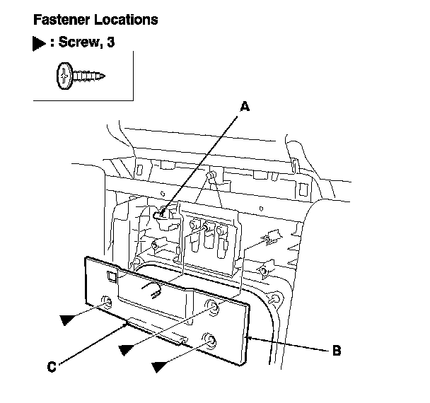 4. Remove the retainer clip (A), then remove the trunk pass-through lid lock cylinder (B) from the lid (C).