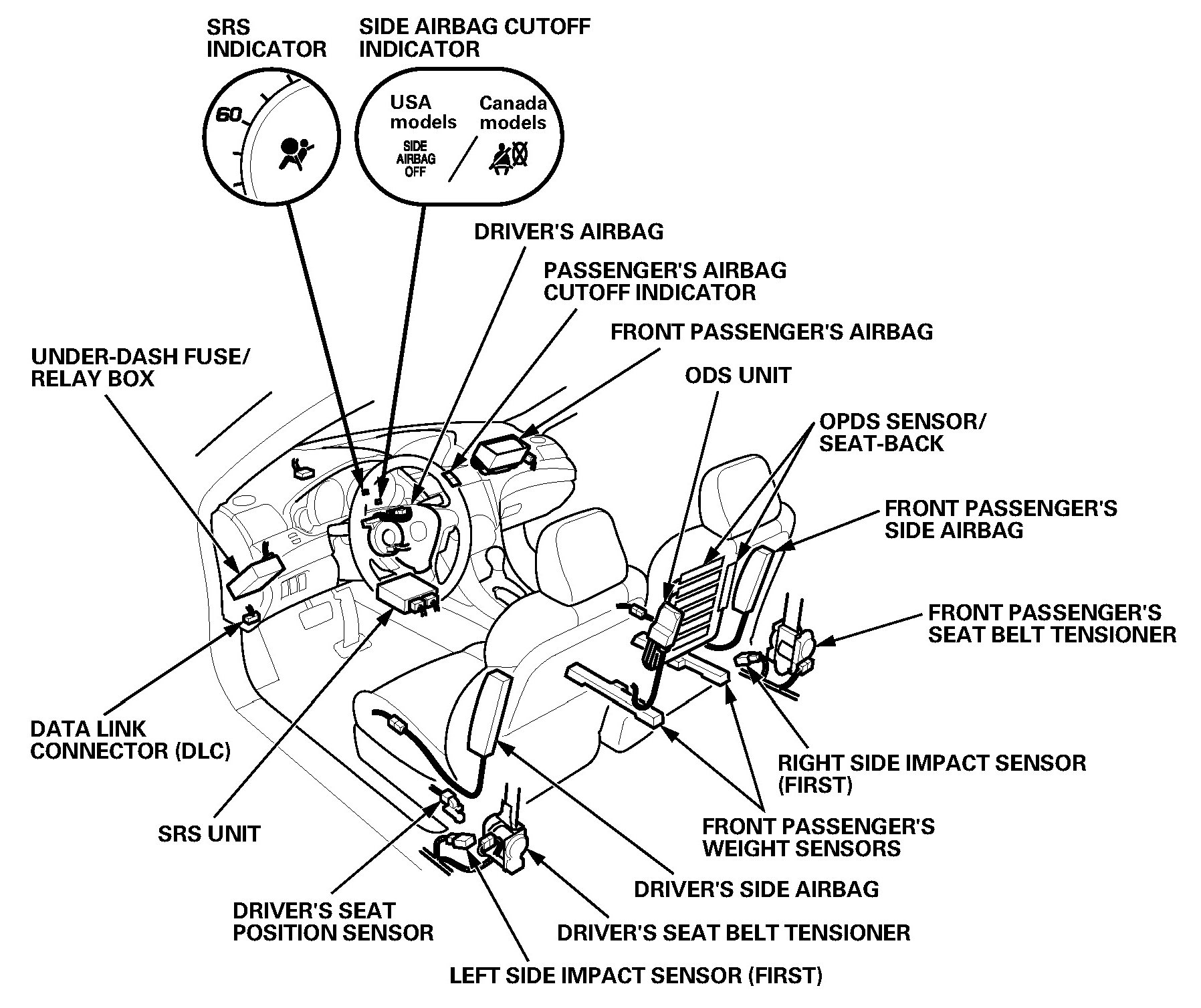 This model has an SRS which includes a driver's airbag in the steering wheel hub, a passenger's airbag in the dashboard above the glove box, the seat belt tensioners in the front seat belt retractors, the side airbags in the front seat-backs, and the side curtain airbags in the sides of the roof. The SRS unit is separate from the airbag assembly and has built-in sensors. The following precautions should be observed when doing sheet metal work, paint work, and repair work around the locations of the SRS components.