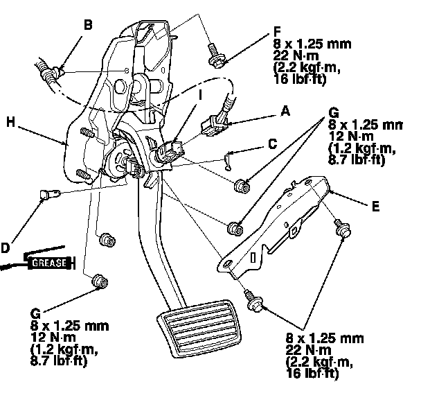 5. Remove the brake pedal bracket mounting bolt (F) and the nuts (G).