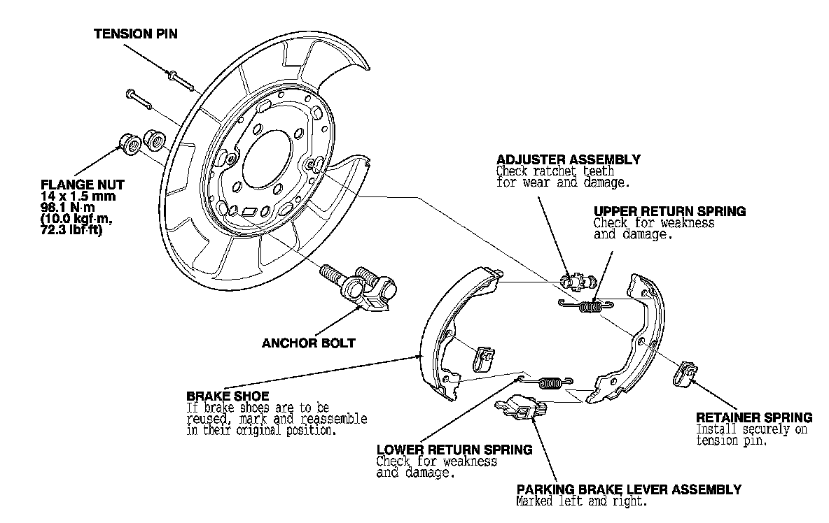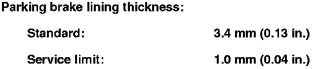 6. If any part of the parking brake lining thickness is less than the service limit, replace all the parking brake shoes as a set. Removal and Replacement