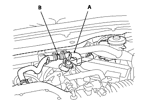 4. Disconnect the brake booster vacuum hose (A) at the booster. The check valve (B) is built into the hose.