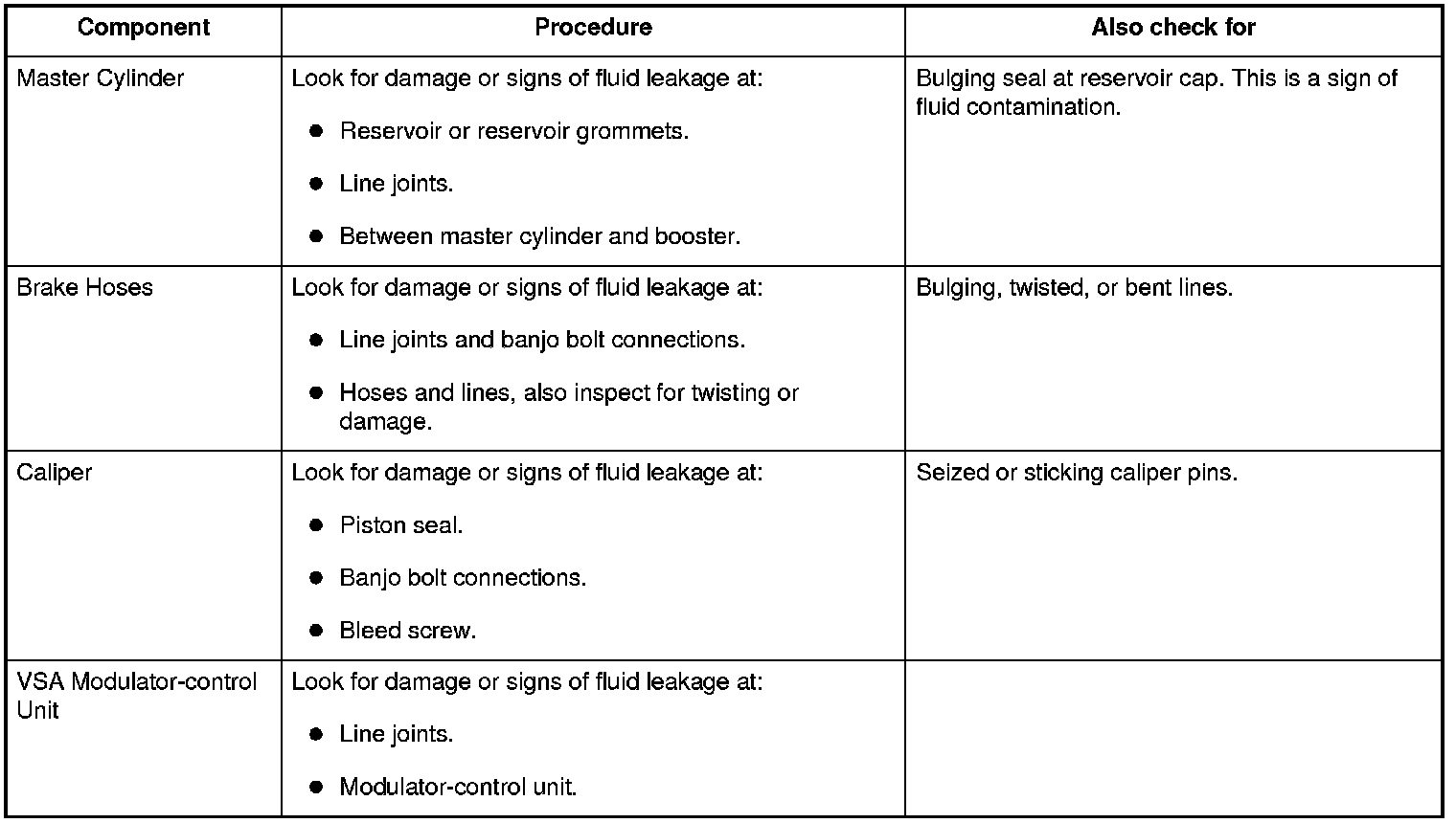 Inspect the brake system components listed. Repair or replace any parts that are leaking or damaged.