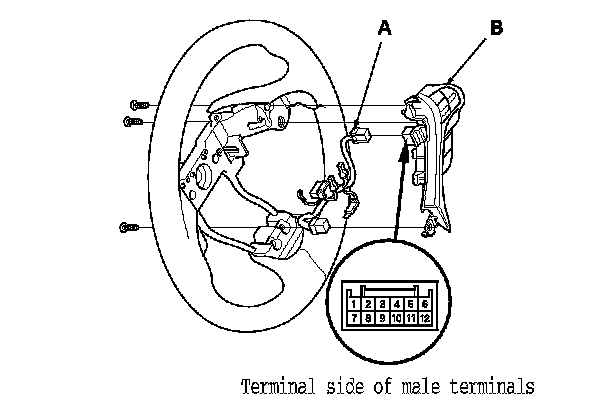 3. Disconnect the cable real subharness connector (A), then remove the steering wheel trim/cruise control combination switch (B).
