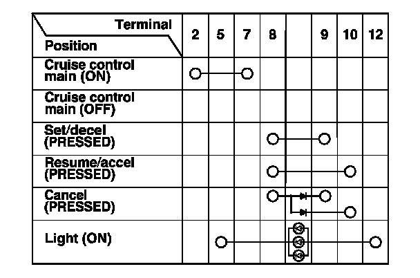 - If there is continuity, and it matches the table, but the cruise control combination switch failure occurred on the cruise control input test, check and repair the wire harness on the switch circuit.