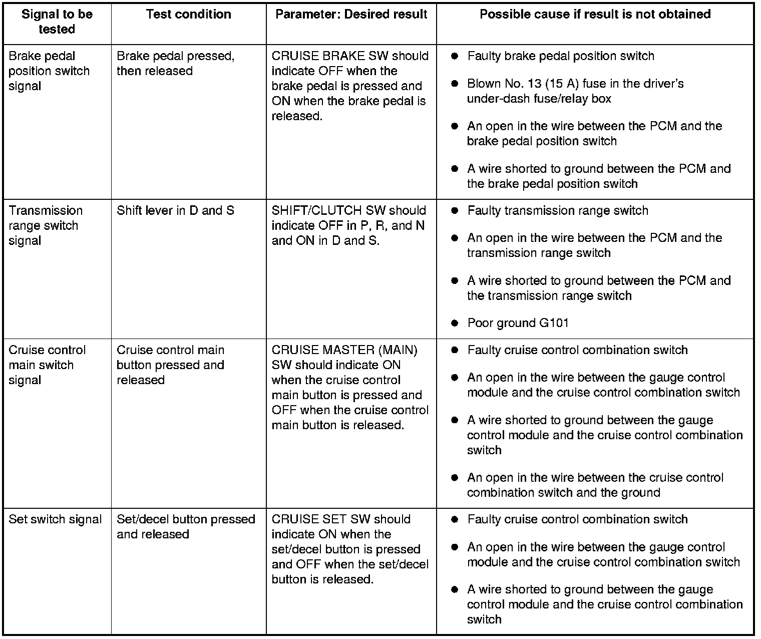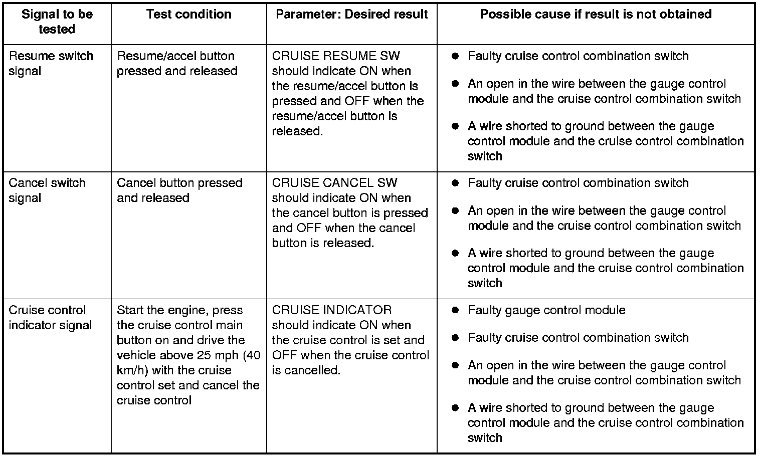 NOTE: Intermittent failures are often caused by loose circuit connections. While monitoring cruise control inputs, flex the circuit wires, and note if any of the test results change.