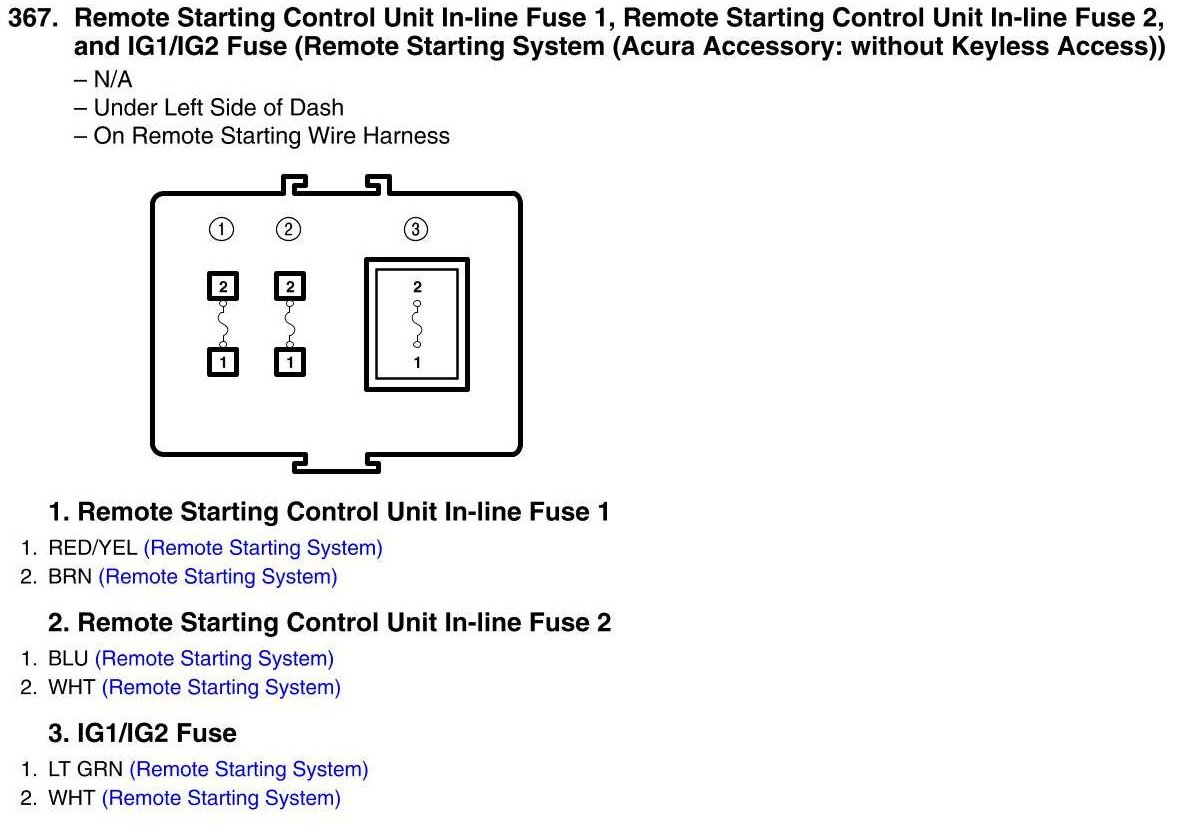 View 367 - Remote Starting Control Unit In-line Fuse 1, Remote Starting Control Unit In-line Fuse 2 and IG1/IG2 Fuse Connector View (Remote Starting System (Acura Accessory: without Keyless Access))