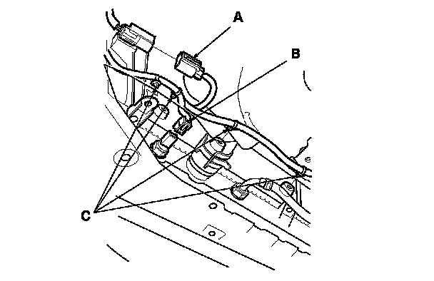 7. Disconnect the radiator fan motor connector (A) and the engine coolant temperature (ECT) sensor 2 connector (B), then remove the harness clamps (C).