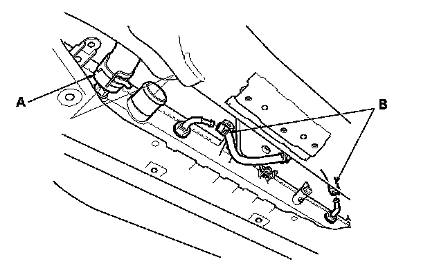 9. Disconnect the automatic transmission fluid (ATF) cooler hoses (B) from the radiator, Service and Repair then plug the cooler hoses and the lines.