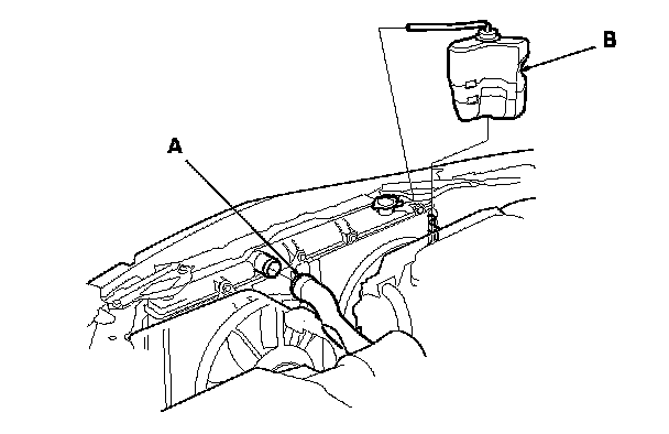 11. Disconnect the upper radiator hose (A) and remove the coolant reservoir (B).