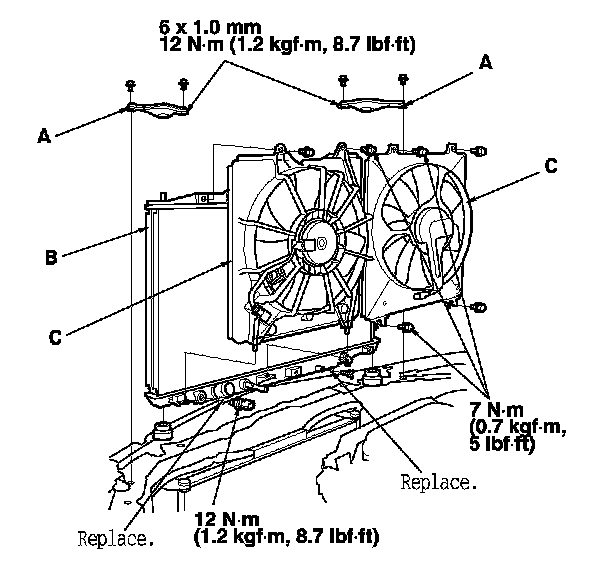 12. Remove the upper brackets (A), then pull up the radiator (B) with fan shrouds (C).