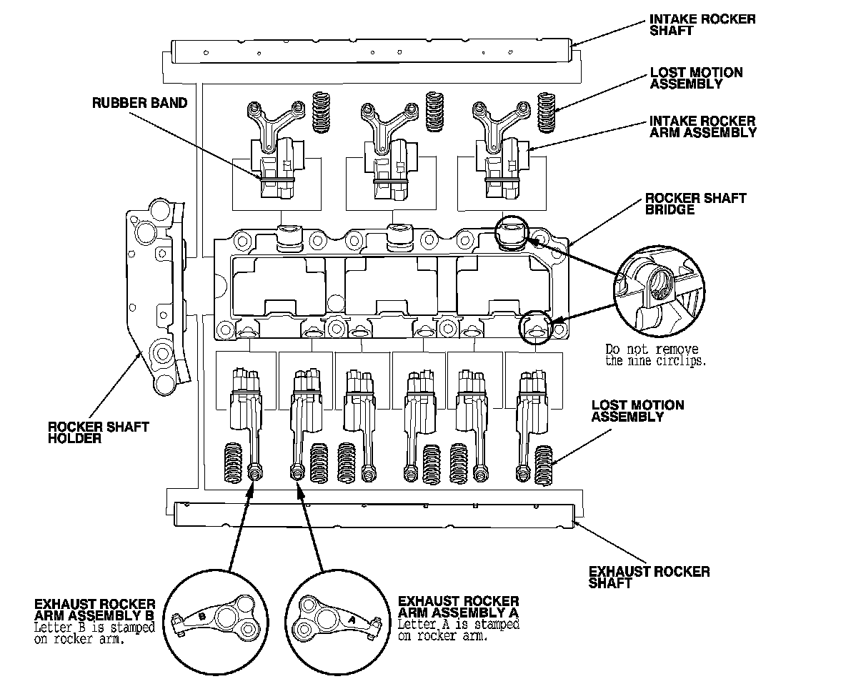 - Never remove any of the circlips that retain the lost motion assemblies in the rocker shaft bridge. The circlips are not available separately, and are factory installed in the rocker shaft bridge. To remove the lost motion assemblies, first remove the rocker shafts and the rocker arms.