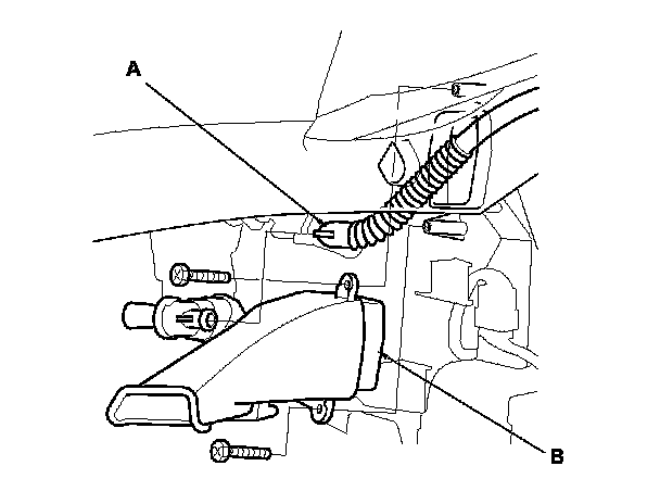 2. Remove the self-tapping screws, the air hose (A), and the driver's heater duct (B).