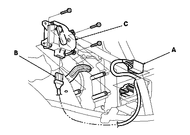 4. Disconnect the 5P connector (A) from the power transistor, and the 7P connector (B) from the passenger's air mix control motor (C). Remove the self-tapping screws and the passenger's air mix control motor from the heater unit.