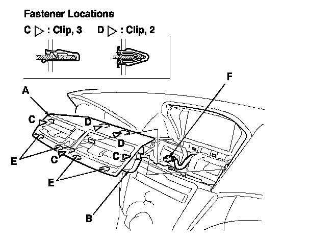 1. Carefully pull one side of the dashboard center vent (A) partially out to release clips (B, C) and the hooks (D), then do the same on the other side. Disconnect the hazard warning switch/passenger airbag cutoff indicator connector (E), then remove the dashboard center vent.