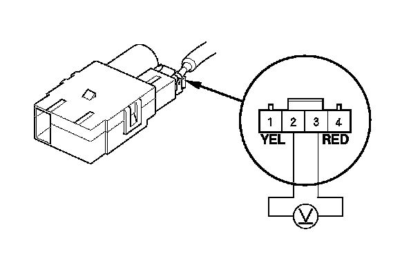 3. Turn the ignition switch to ON (II), or press the engine start/stop button to select the ON mode. Measure the voltage between the terminals with the (+) probe on terminal No. 2 and the (-) probe on the No. 3 terminal with the connector connected.